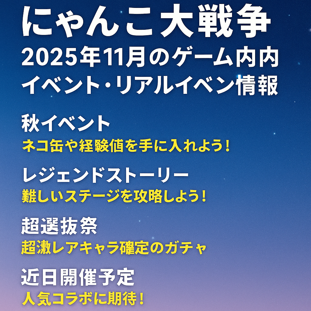次回イベント情報やアップデート予定も順次発表される見込みです。公式情報をチェックしながら、最新のイベントに備えましょう。2025年11月の「にゃんこ大戦争」は、イベント・ガチャ・ステージが盛りだくさんで、どのプレイヤーにも楽しみが広がっています。秋のイベントでアイテムを集め、レジェンドステージで腕を磨き、超選抜祭で最強キャラを仲間にしましょう。冬に向けてますます盛り上がるにゃんこ大戦争を、あなたも一緒に楽しんでください!