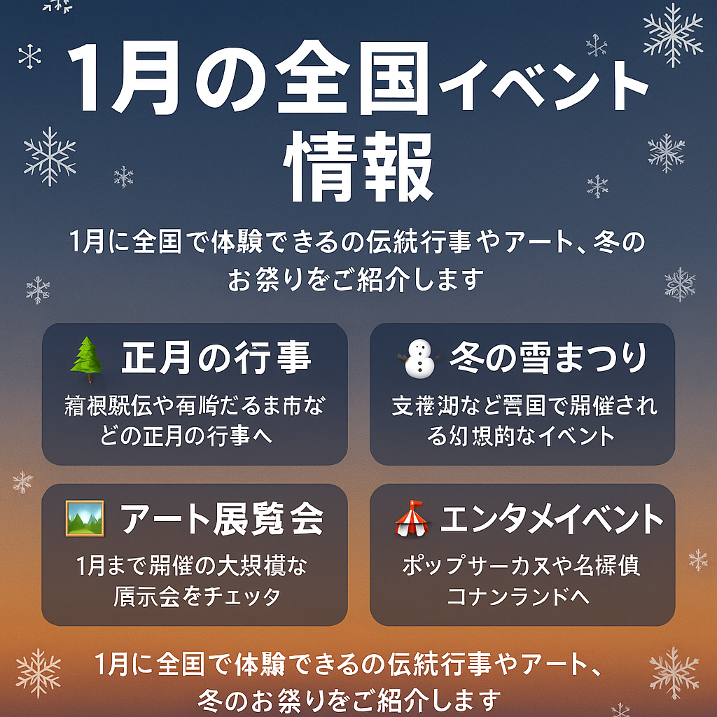 1月は、正月行事からイルミネーション、雪まつり、アート展示など、冬の魅力を存分に味わえる季節です。家族や友人との外出はもちろん、一人旅でも心に残る冬の美しさを体感できます。寒さ対策をしっかりしながら、1月ならではの景色とイベントに触れてみてください。来月からはまた新しいイベントが始まるため、これからの最新情報にもぜひ注目してみましょう。