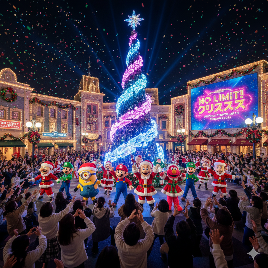 ユニバーサル・スタジオ・ジャパン(USJ)では、毎年大人気の冬イベント「NO LIMIT! クリスマス」が開催されます。2025年11月8日(土)から2026年1月6日(火)までの約2か月間、パーク全体がまるで光の世界に変わります。ミニオンやマリオ、ハローキティなど人気キャラクターたちがクリスマス衣装で登場し、笑顔あふれるホリデーシーズンを盛り上げます。