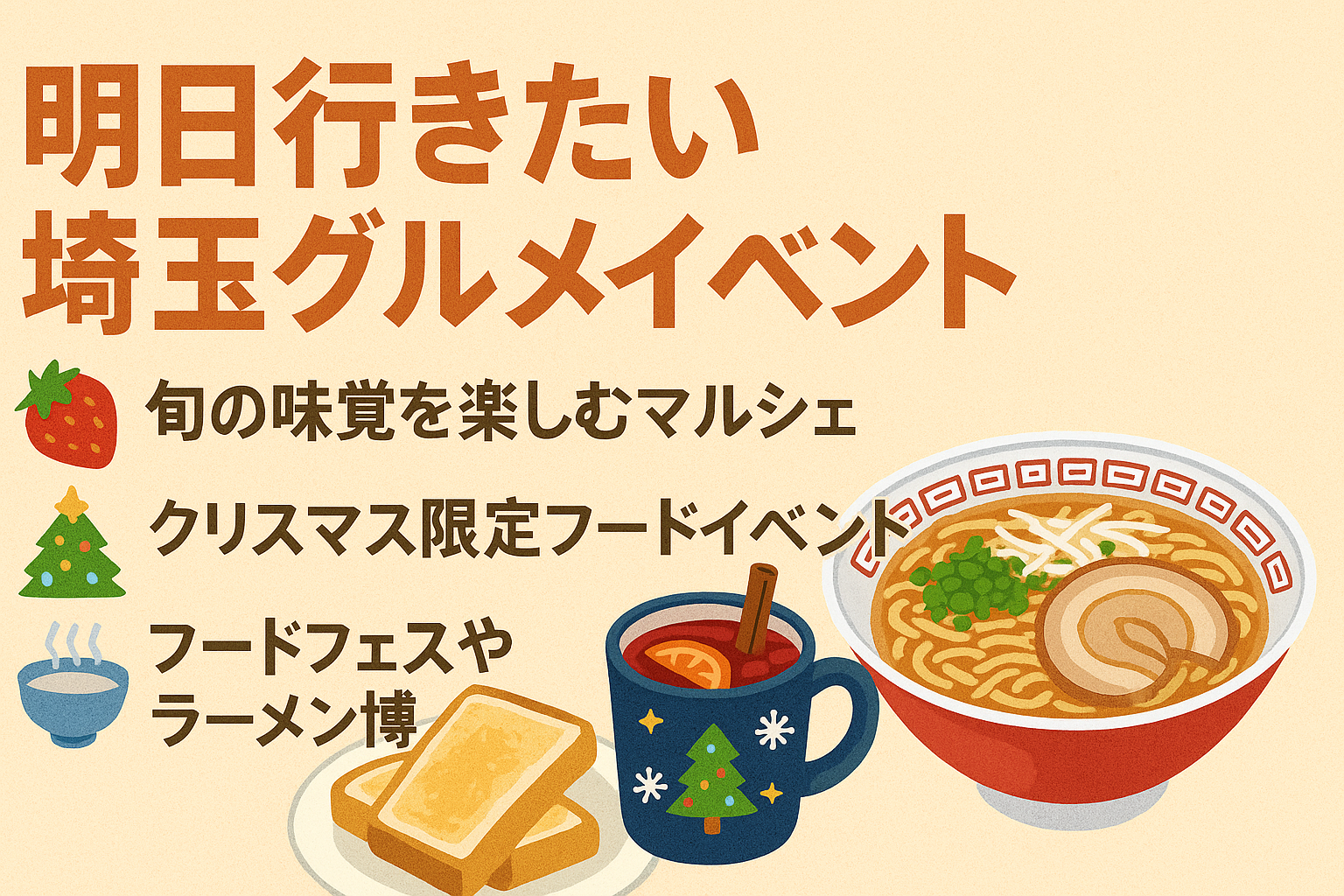 この記事では、2025年12月7日(日)に埼玉県で開催される注目のグルメイベントを紹介します。どのイベントもアクセスしやすく、地元の味覚を手軽に楽しめる内容ばかりです。週末のおでかけ計画にぜひ役立ててください。