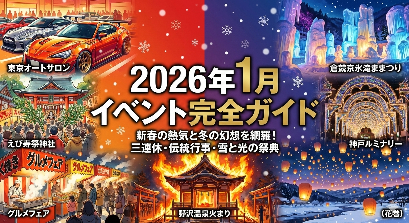 2026年1月は、新しい年の始まりに合わせて、全国でたくさんのイベントが開かれます。特に、旅行を計画している人や、家族で外出したい人におすすめの時期です。成人の日に関係したにぎやかな行事や、雪や光を使った冬ならではのお祭りなど、家族でも友だち同士でも楽しめる内容がそろっています。お正月気分を感じながら外に出かけることで、日常とは少しちがう体験ができるのも、この時期ならではの魅力です。この記事では、「2026 1 月 イベント」の中から、特に人気が高く、初めての人でも行きやすい行事を、三連休と月後半に分けて分かりやすく紹介します。どんな人に向いているか、どんな楽しみ方ができるかもあわせてまとめています。